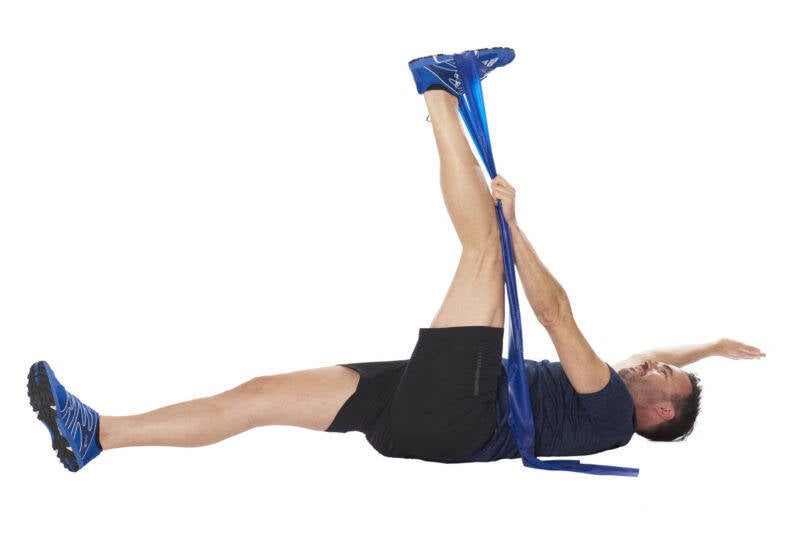 - Startposition: Rückenlage (evtl. Bett), Band um den linken Mittelfuß legen und das linke Bein so gut wie möglich aufrichten/strecken. Das rechte Bein gestreckt am Boden halten